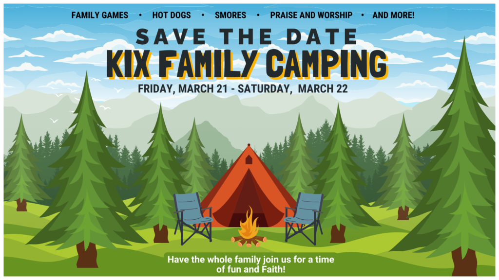 Come join us for the for the inaugural KiX Family Camp Out! We are going to have family, games, praise and worship, and time to hang out and laugh! Don’t forget about the hot dog dinner and S’MORES on Friday evening. We will also spend time talking about our PATH prayer to assist families in learning to pray individually and with each other.